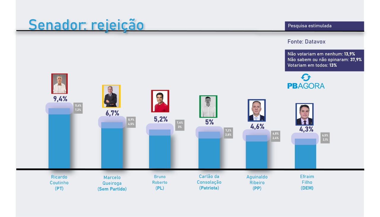 Contratada pelo PB Agora e realizada pelo Instituto Datavox, a 1ª pesquisa para senador da República de 2022 põe o ex-governador Ricardo Coutinho (PT) como o mais rejeitado pelo eleitorado paraibano com 9,4% dos paraibanos cravando não votar nele nas eleições deste ano.