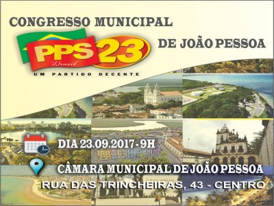 O diretório do PPS em João Pessoa realiza congresso neste sábado, a partir das 9h00, na Câmara Municipal, quando estará reconduzindo a presidência o vereador Bruno Farias, tendo na chapa como vice-presidente o economiário e ex-secretário de Esportes, Sergio Meira.