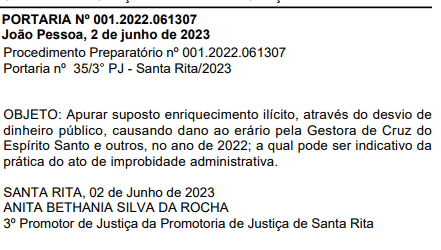 A promotora de Justiça, Anita Bethania Silva da Rocha, decidiu abrir o Procedimento Preparatório nº 001.2022.061307 para investigar uma possível ocorrência de enriquecimento ilícito por parte da gestora de Cruz do Espírito Santo durante o ano de 2022, Alinny Povão, através do desvio de dinheiro público, causando danos ao erário.