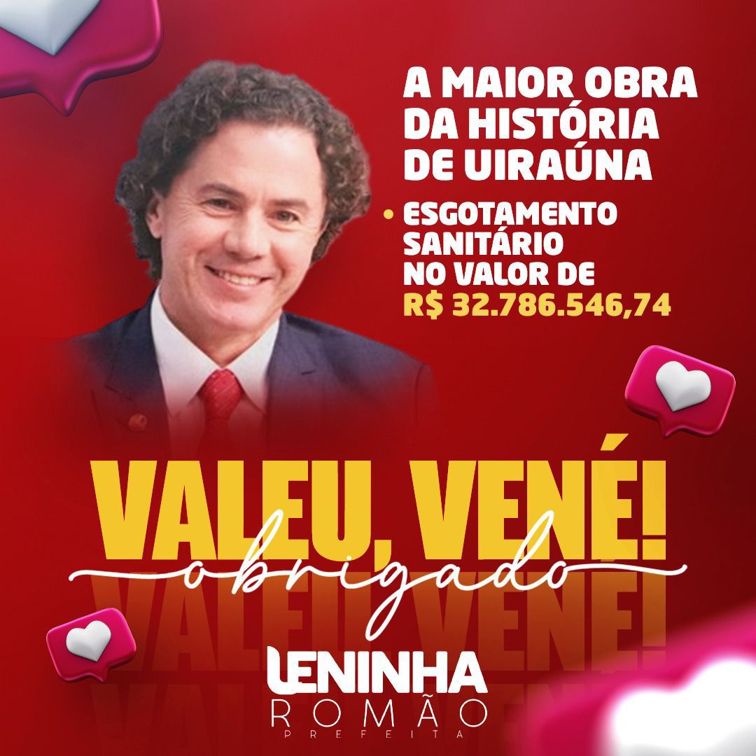 “A maior obra da nossa história! Um investimento de quase 33 milhões de reais para acabar com o problema de esgotamento sanitário de Uiraúna! É mais saúde, infraestrutura, dignidade e qualidade de vida para o nosso povo! Gratidão, meu Senador Veneziano Vital! Valeu, Vené!”, disse a prefeita de Uiraúna ao agradecer ao senador pelos R$ 32.786.546,74, em verbas para o projeto de esgotamento sanitário na cidade.