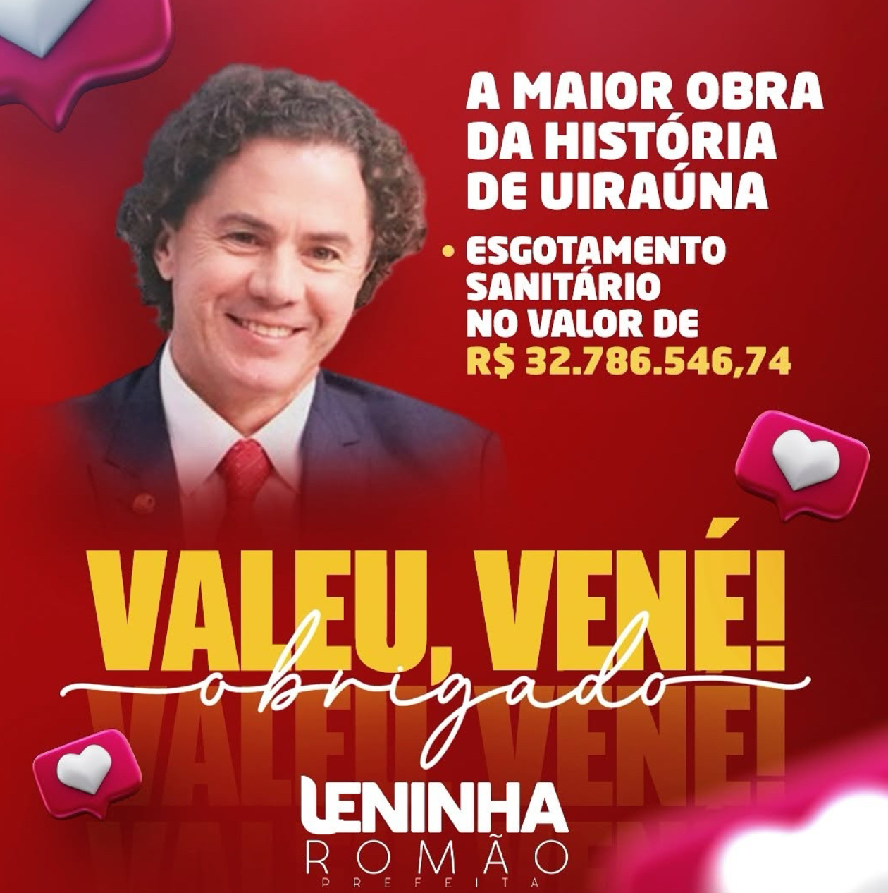 “Neste 13 de dezembro, essa data ficará na história de Uiraúna. Estou aqui na Caixa ao lado do diretor Geovane, pessoa que tem um atendimento diferenciado, assinando aqui hoje o contrato do nosso esgotamento sanitário a obra do século, uma obra de R$ 32.786.546,74, obra essa que tem um carimbo especial do nossos senador Veneziano, ao qual quero expressar o meu agradecimento a essa obra tão importante para a nossa cidade e eu quero expressar o meu agradecimento especial em nome do povo de Uiraúna a Veneziano”, disse a prefeita de Uiraúna ao agradecer novamente ao senador pelas verbas para o projeto de esgotamento sanitário na cidade. Em julho deste ano o projeto tinha sido aprovado, com a articulação de Veneziano.