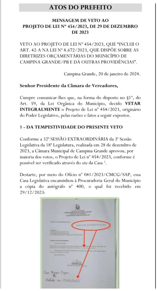 O prefeito Bruno Cunha Lima vetou integralmente emenda à ao projeto da Lei Orçamentária Anual 2024 (LOA) de Campina Grande. O veto está relacionado as emendas impositivas e está publicado em separata do Semanário Oficial do Município.