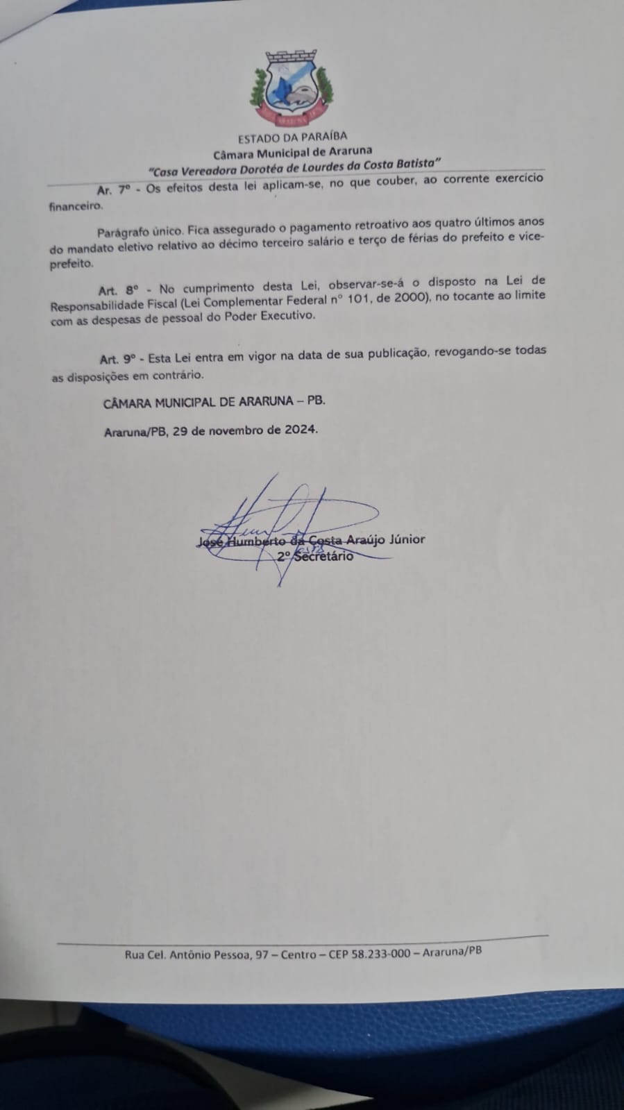 Verificando o projeto, é possível notar que, também 2º secretário da atual gestão, o sobrinho do prefeito Vital, José Humberto da Costa Araújo Júnior, assinou a medida. Da mesma forma, os salários do vice e secretários da pasta devem aumentar em até 50% conforme publicação posterior no Diário Oficial do Município.
