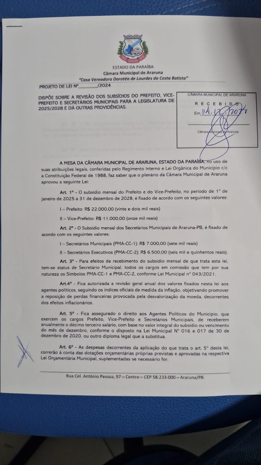 Na tarde de ontem (04), o prefeito de Araruna, Vital Costa (PP), protocolou um projeto de lei junto a Câmara de Vereadores que visa aumentar seu próprio salário e de seus secretários. Segundo informações, o gestor tentava, junto de seu sobrinho, o vereador Junior Costa (PP), fazer com que a Câmara municipal aprovasse a iniciativa.