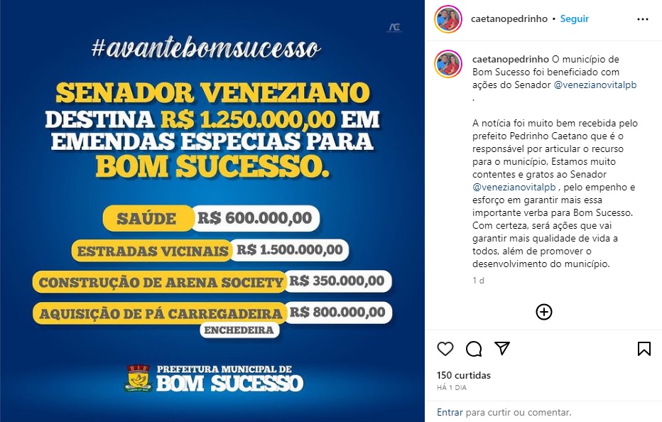 Por meio das redes sociais, o prefeito agradeceu mais essa destinação de recursos do senador. “Estamos muito contentes e gratos ao nosso senador Veneziano, pelo empenho e esforço em garantir mais investimentos para Bom Sucesso. Com certeza, será ações que vai garantir mais qualidade de vida a todos, além de promover o desenvolvimento do município.’’ Comentou o gestor.