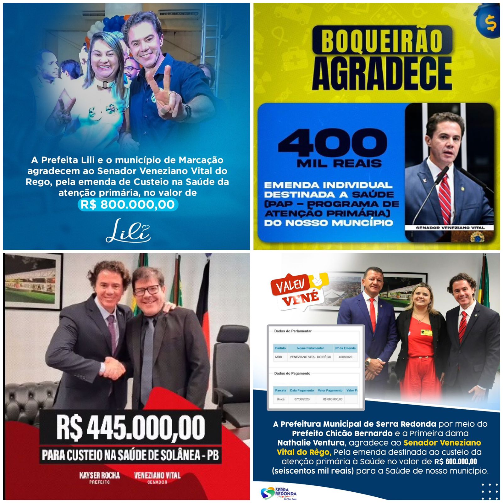 “Obrigado, Vené! A Prefeitura Municipal de Serra Redonda, por meio do Prefeito Chicão Bernardo e da Primeira Dama Nathalie Ventura, agradece ao Senador Veneziano Vital do Rêgo pela emenda destinada ao Custeio da Atenção Primária à Saúde no Valor de R$ 600.000, 000 (seiscentos mil reais) para a Saúde de nosso município”, postou o Prefeito Chicão. Confira: https://www.instagram.com/p/CtWvvLqrg21/?igshid=MTc4MmM1YmI2Ng%3D%3D