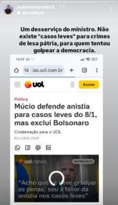 Para o ministro do governo Lula III, “deve-se graduar as penas. Deve ser uma para quem organizou; quem foi uma marionete, é outra coisa. Quem quebrou uma cadeira não pode ser responsável por quem fez outras coisas. Devemos graduar, mas não politizar isso. Deve ser uma ação da Justiça. Sou a favor da anistia dos casos leves”, afirmou.