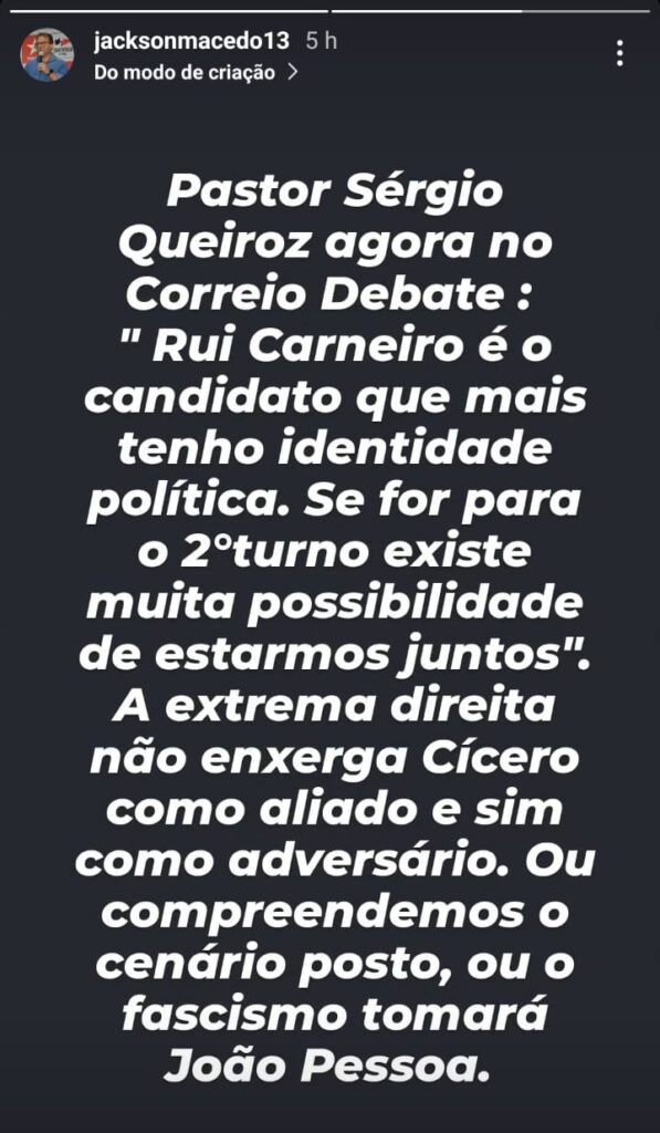 Com base nas declarações concedidas pelo pastor Sérgio Queiroz, Jackson analisa que “a extrema direita não enxerga Cícero como aliado e sim como adversário”. E resume: “Ou compreendemos o cenário posto, ou o fascismo tomará João Pessoa.”