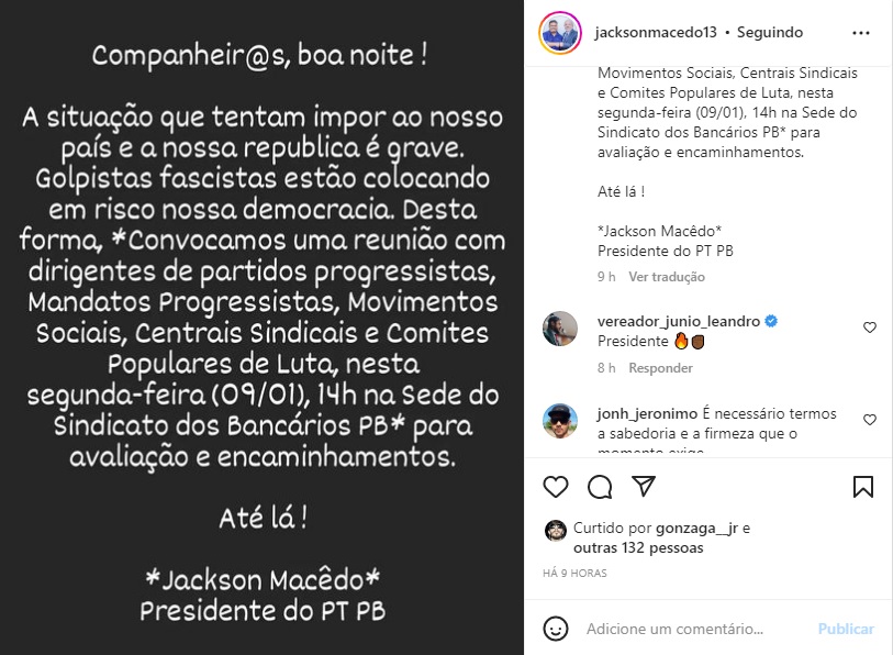 Por meio das suas redes sociais, o presidente estadual do PT paraibano, Jackson Macedo, emitiu uma nota na noite de ontem (08), sobre os atos golpistas de bolsonaristas ocorrido também na tarde e noite deste domingo. Segundo Jackson, uma reunião de urgência dos movimentos sociais foi marcada uma reunião nesta segunda-feira (09), ás 14h, na Sede do Sindicato dos Bancários da Paraíba, na capital.