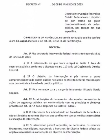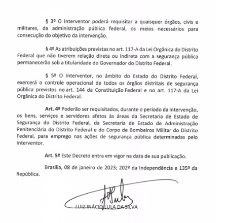 O presidente Lula assinou neste domingo (8) um decreto de intervenção federal na segurança do Distrito Federal. A medida foi tomada após terroristas bolsonaristas invadirem o Palácio do Planalto, o Congresso Nacional e o Supremo Tribunal Federal (STF).