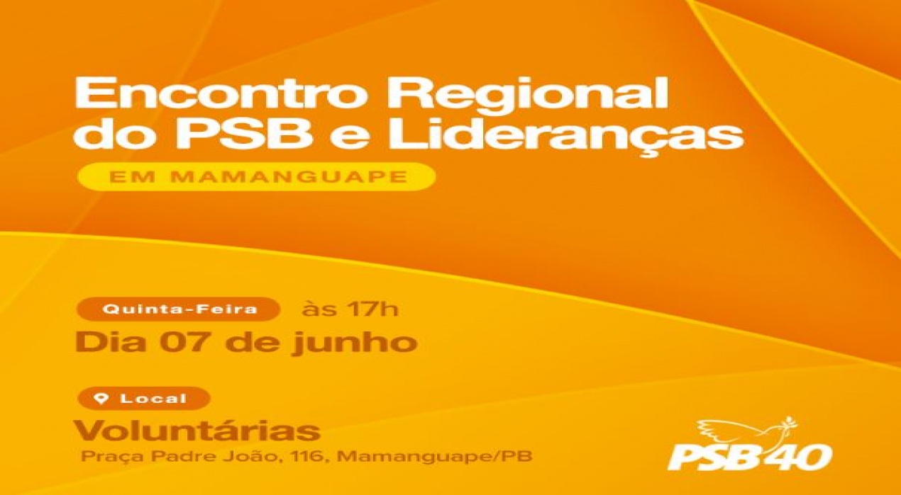 A Direção Estadual do PSB na Paraíba, tem a honra de convidar parlamentares, gestores, filiados(as) e a população em geral, para participar do Encontro Regional do PSB na cidade de Mamanguape, que será realizado nesta quinta-feira (07), às 17h00, no clube das Voluntárias. O Encontro contará com a participação do dirigente estadual e Pré-candidato ao Governo da Paraíba, João Azevêdo, além de diversas lideranças socialistas e de outros partidos. Participe!