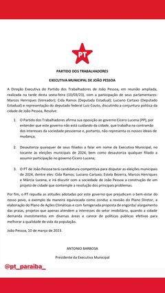 No documento, assinado pelo presidente Antonio Barbosa, o PT afirma que terá “candidatura competitiva” ao cargo de prefeito de João Pessoa nas eleições do ano que vem e cita Cida Ramos, Luciano Cartaxo, Estela Bezerra, Marcos Henriques e Márcia Lucena como possíveis candidatos.