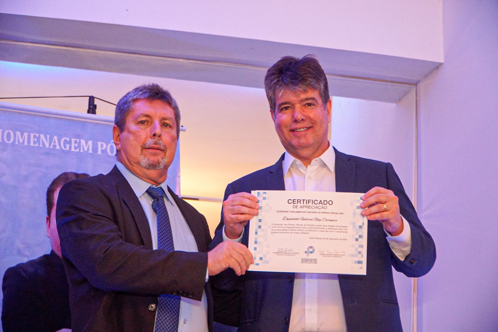 Nesta última sexta-feira (03), o deputado federal Ruy Carneiro participou de um evento comemorativo, em João Pessoa. Na ocasião o parlamentar recebeu uma homenagem do Sindicato dos Peritos Oficiais da Paraíba. O reconhecimento, fruto do empenho de Ruy em favor dos peritos na Câmara, foi entregue pelo presidente do Sindperitos, Humberto Pontes.