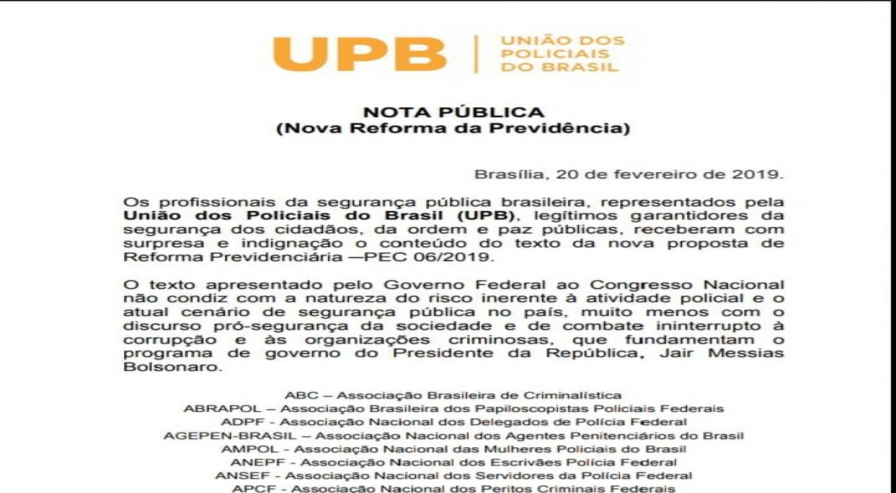 O texto da Reforma da Previdência desagradou aos servidores vinculados às atividades policiais. A União dos Policiais do Brasil divulgou nota, nesta quarta-feira, criticando o que foi apresentado pelo presidente Jair Bolsonaro. Pela proposta, os funcionários terão que trabalhar até os 55 anos, para ambos os sexos, além de acumulares 25 anos de contribuição, se mulher, e 30 anos, se homem, além de 15 anos de exercício em cargo de natureza estritamente policial, se mulher, e 20 anos, se homem.