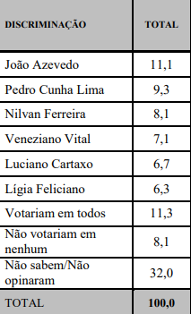 Em segundo lugar, quem surge é Pedro Cunha Lima com 9,3%, seguido por Nilvan Ferreira (PTB) 8,1%; Veneziano Vital do Rêgo (MDB): 7,1%, Luciano Cartaxo (PT): 6,7% e Lígia Feliciano (PDT): 6,3%. Não votariam em nenhum: 8,1%; Não sabem ou não opinaram: 32%; Votariam em todos: 11,3%.