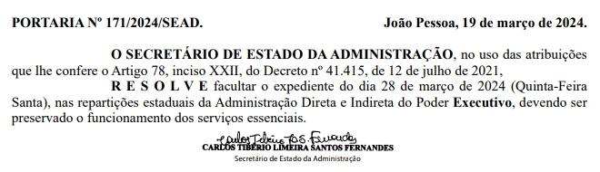 De acordo com a Portaria nº 171/2024, publicada na edição desta quinta-feira (21) do Diário Oficial e assinada pelo Secretário de Administração, Tibério Limeira, deve ser preservado o funcionamento dos serviços essenciais.