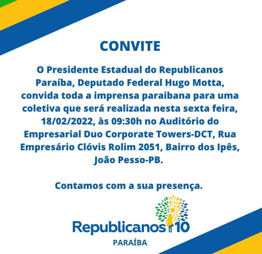 O Republicanos, comandando no estado pelo deputado federal Hugo Motta, vai hoje (18), apoio a pré-candidatura de Efraim Filho (União Brasil) ao Senado. Uma coletiva de imprensa acontecerá às 9:30h, no Auditório do Empresarial Duo Corporate Towers-DCT, no bairro dos Ipês, em João Pessoa.