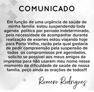 O ex-prefeito de Campina Grande, Romero Rodrigues, do PSD, emitiu comunicado neste domingo (19), para anunciar a suspensão de toda a sua agenda política, por tempo indeterminado.