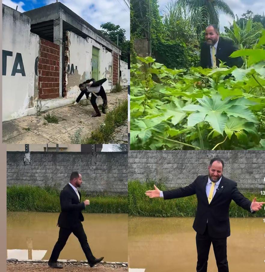 “Isso aqui é uma creche, se o prefeito quiser reformar… Isso aqui é um buraco. Se o prefeito quiser tapar… Aqui é uma rua. Se o prefeito quiser calçar… Aqui é um canal. Se o prefeito quiser limpar”, disse o parlamentar, enquanto executava pequenas “cambalhotas” e pulos saltitantes coreografados para ilustrar sua crítica.