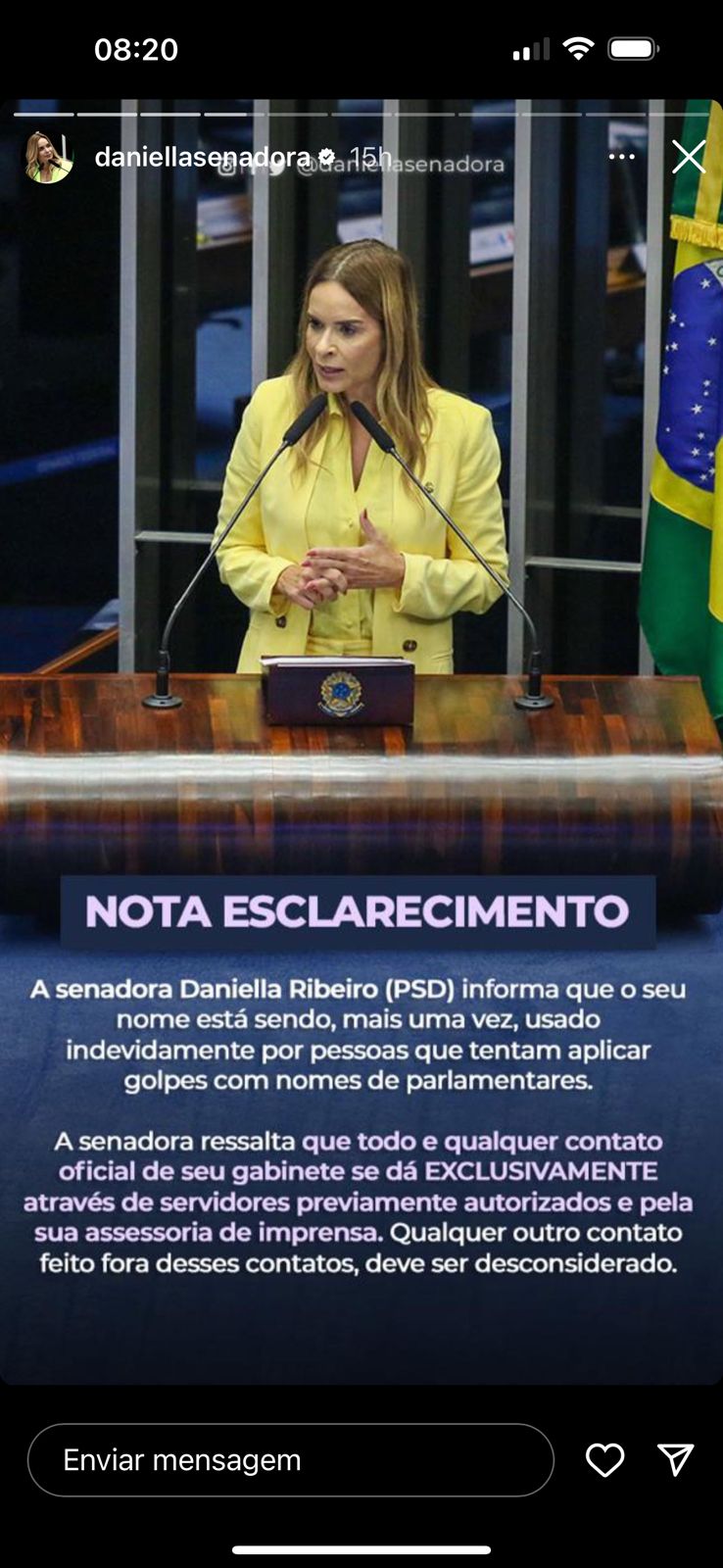 A senadora Daniella Ribeiro (PSD) voltou ser alvo de criminosos ontem, (2) que estariam usando o seu nome na tentativa de aplicar golpes. Ao tomar conhecimento do fato a senadora garantiu que todo e qualquer contato oficial de seu gabinete ser dar por meio de servidores previamente autorizados e pela sua assessoria de imprensa.