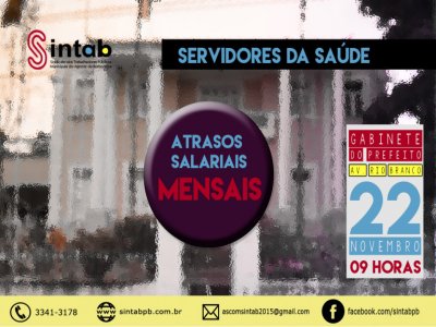 Os servidores da Saúde vão as ruas nesta terça-feira, dia 22, protestar contra o atraso salarial que a prefeitura de Campina Grande está impondo mensalmente à categoria. A partir das 09 horas, a concentração do ato será no Gabinete do Prefeito, em que toda a população campinense também está convocada para participar dessa reivindicações em prol da dignidade e do cumprimento do que estabelece a lei, ou seja, o pagamento até o quinto dia útil do mês.