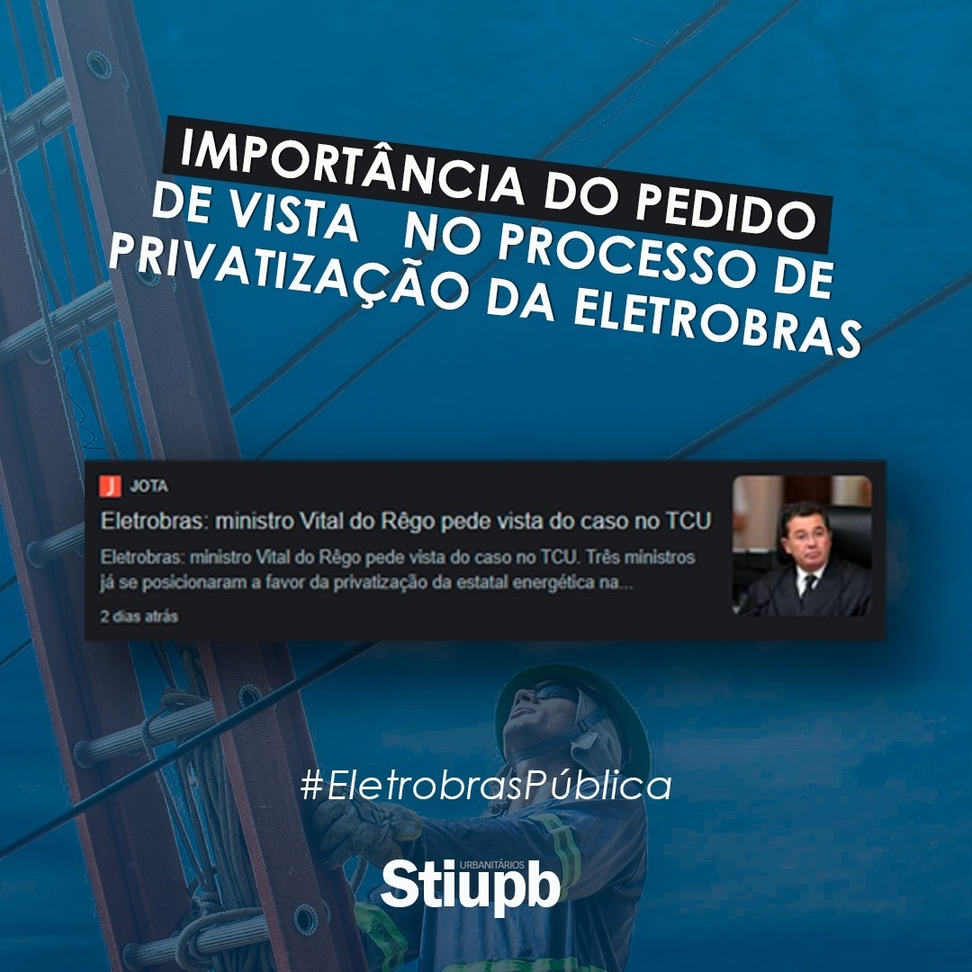 O Sindicato dos Urbanitários da Paraíba (Stiupb), por sua diretoria, reconhece a importante decisão tomada na tarde da última quarta-feira, 15, pelo Ministro do Tribunal de Contas da União (TCU), Vital do Rêgo Filho, quando pediu vista sobre o processo de privatização da Eletrobras.