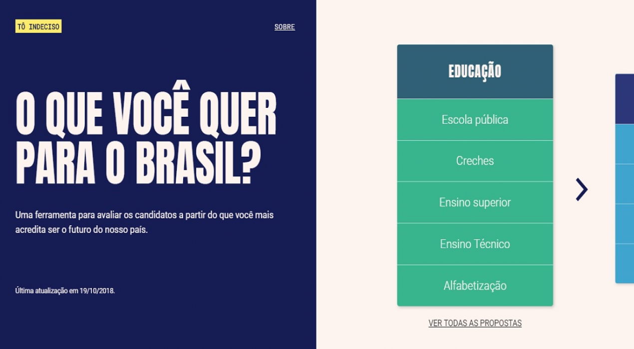 Diante de um cenário político polarizado, no qual a disseminação de informações falsas e debate inflamado, superficial e improdutivo sobre a política do país gera um panorama de intolerância, cresce o grupo de eleitores sem posição, saturados e frustrados com o tema. Vendo essa realidade foi criado o site nacional “Tô indeciso”, ao qual analisa os planos de governo dos dois candidatos presidenciáveis. Basta acessar: (http://toindeciso.com/#/propostas).
