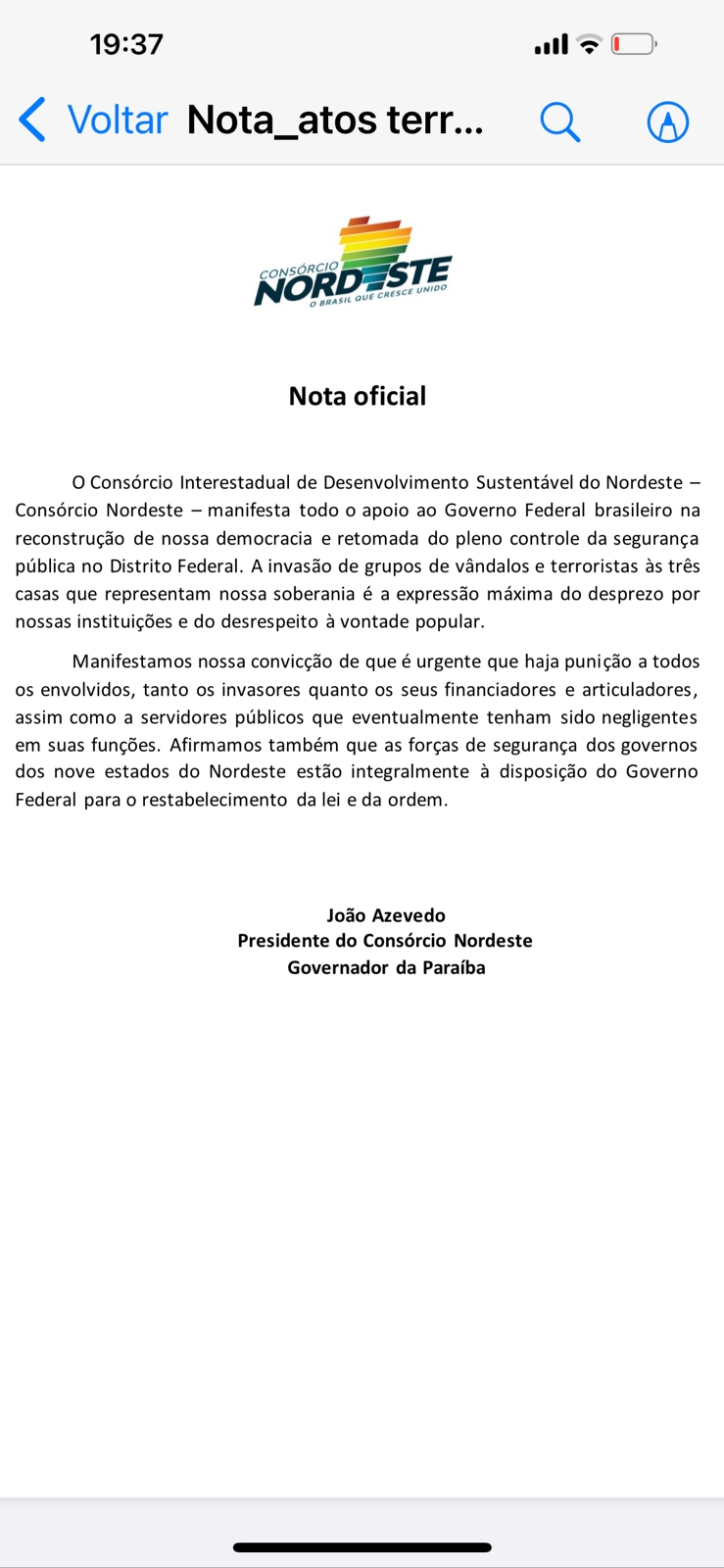 O governador da Paraíba, João Azevêdo, lamentou os atos de manifestantes bolsonaristas que neste domingo (08) invadiram os prédios do Congresso, plenário do STF e Palácio do Planalto, em Brasília.