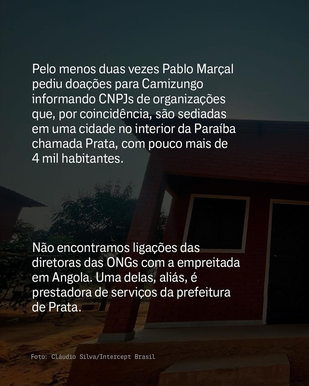 Uma investigação do Intercept Brasil descobriu que Marçal tem solicitado doações para o projeto citando o CNPJ de pelo menos duas organizações não governamentais (ONGs) sediadas em Prata, na Paraíba, uma cidade com pouco mais de 4 mil habitantes. No entanto, não foi encontrada nenhuma ligação das diretoras dessas ONGs com o projeto em Angola. Curiosamente, uma das ONGs mencionadas é prestadora de serviços da prefeitura de Prata.