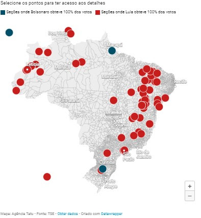 Enquanto Lula obteve 100% dos votos válidos em 143 urnas, Bolsonaro conseguiu o feito em apenas quatro seções. É o que mostram os dados levantados pela Agência Tatu a partir de dados abertos do Tribunal Superior Eleitoral (TSE).