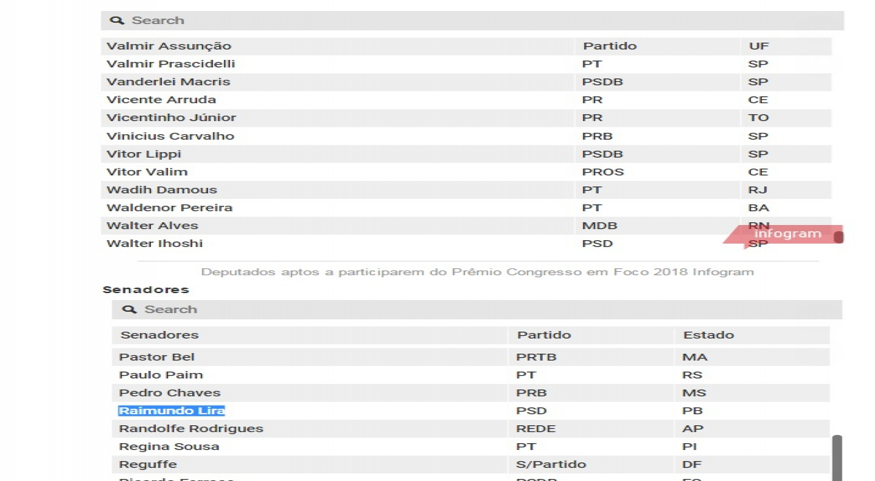 Conhecido entre os parlamentares como o “Oscar da política brasileira”, o Prêmio Congresso em Foco dá um grande passo nesta segunda-feira (18) com a divulgação da lista preliminar dos deputados e senadores aptos a serem votados. Ou seja, aqueles que exerceram mandato este ano por ao menos 60 dias e que não respondem a acusações criminais. Em 2017, o parlamentar paraibano que mais conseguiu destaque na premiação foi o senador Raimundo Lira (PSD), que novamente teve seu nome apto à premiação.