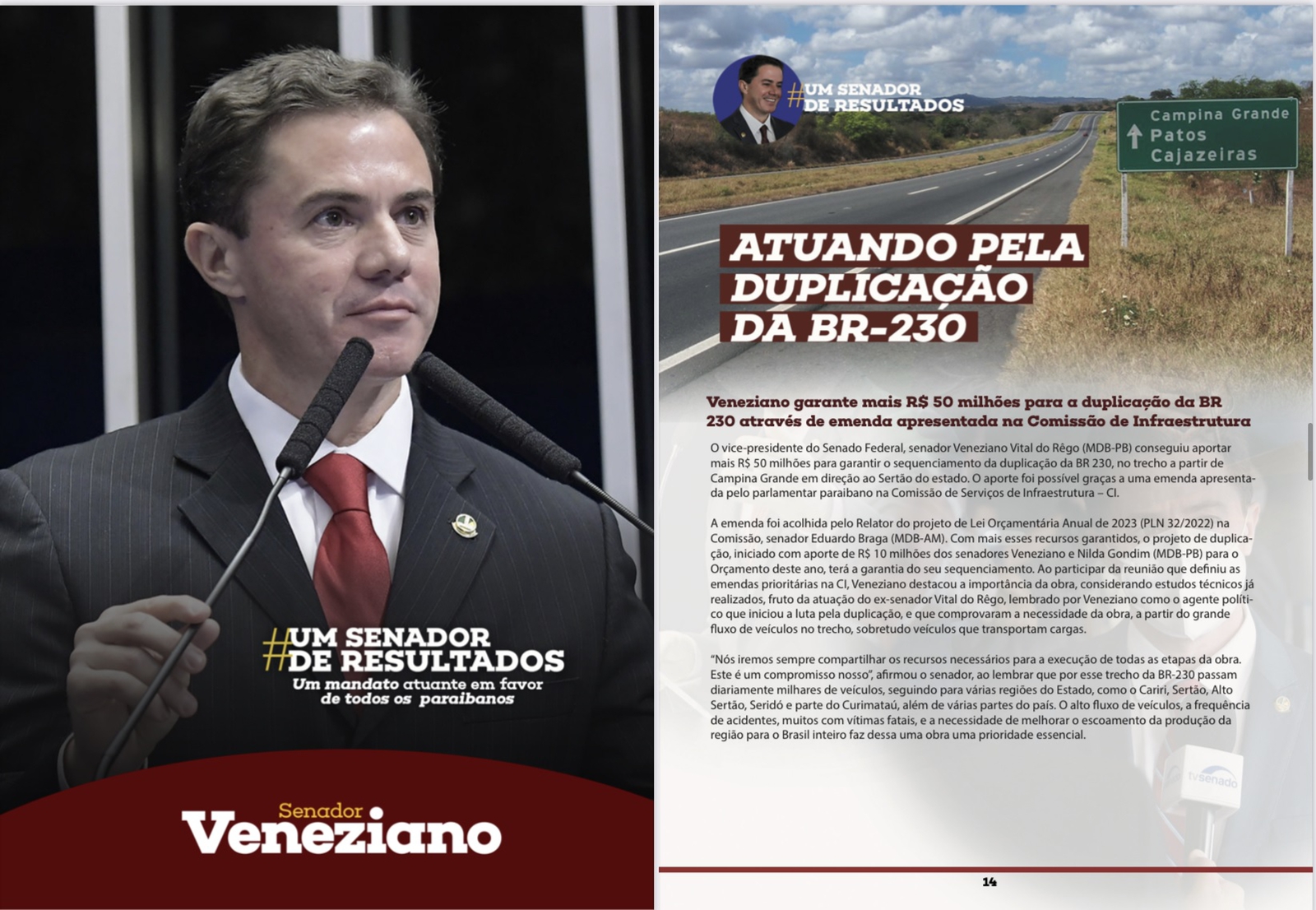 “Uma oportunidade de conhecer as ações que consagraram Veneziano como um dos parlamentares mais atuantes do país, de acordo com o Congresso em Foco”, diz mensagem da Assessoria de Comunicação do Senador, ao apresentar a revista, considerada por Veneziano como “uma importante ferramenta para a prestação de contas junto ao povo paraibano”.