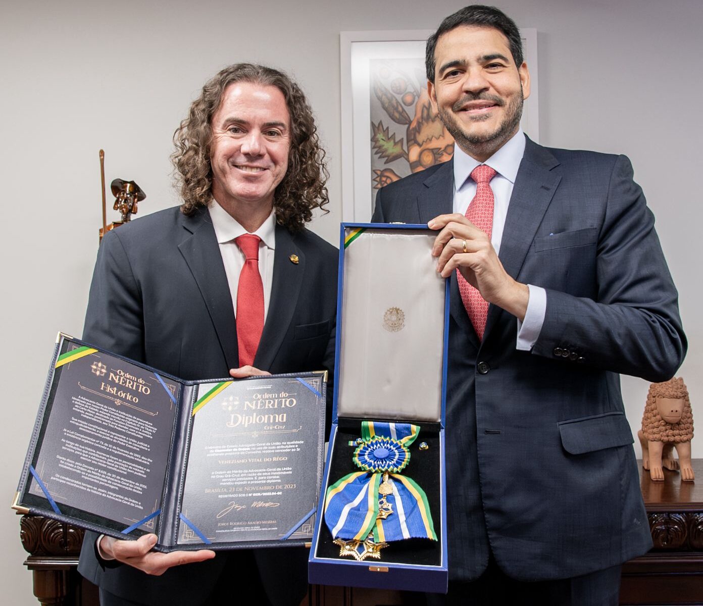 A Advocacia-Geral da União (AGU), por meio do Ministro da Advocacia Geral da União, Jorge Messias, concedeu ontem (17), ao líder da maioria no Senado, Veneziano Vital do Rêgo (MDB-PB), a comenda da Ordem do Mérito, no grau Grã-Cruz. A cerimônia de entrega ocorreu na sede da AGU, em Brasília.