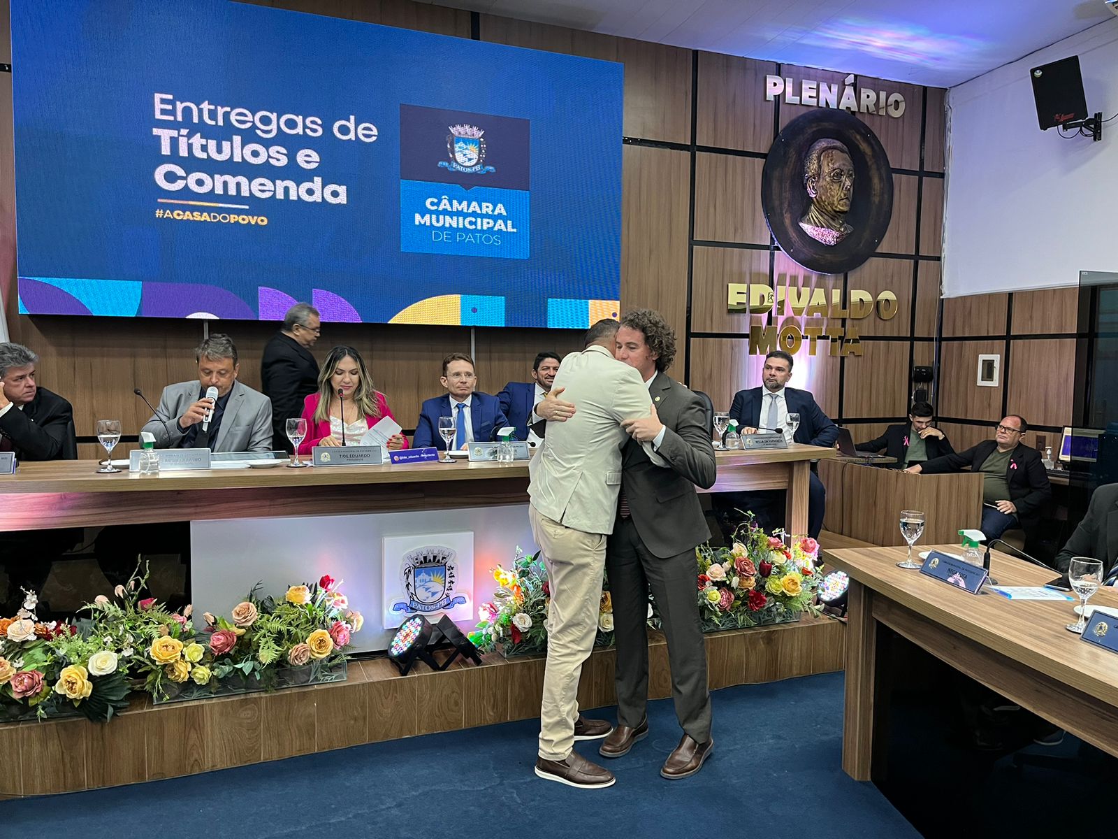 “Agradeço ao vereador Ramon Pantera e aos demais que aprovaram a propositura. Agradeço também a todos os que estão aqui e à cidade de Patos, que tem nos concedido a oportunidade de estar no Senado da República, em Brasília. Eu só posso retribuir com aquilo que o povo espera de todos nós, homens públicos, que é trabalho. Ser cidadão patoense só aumenta o nosso compromisso com o desenvolvimento da cidade”, afirmou Veneziano.