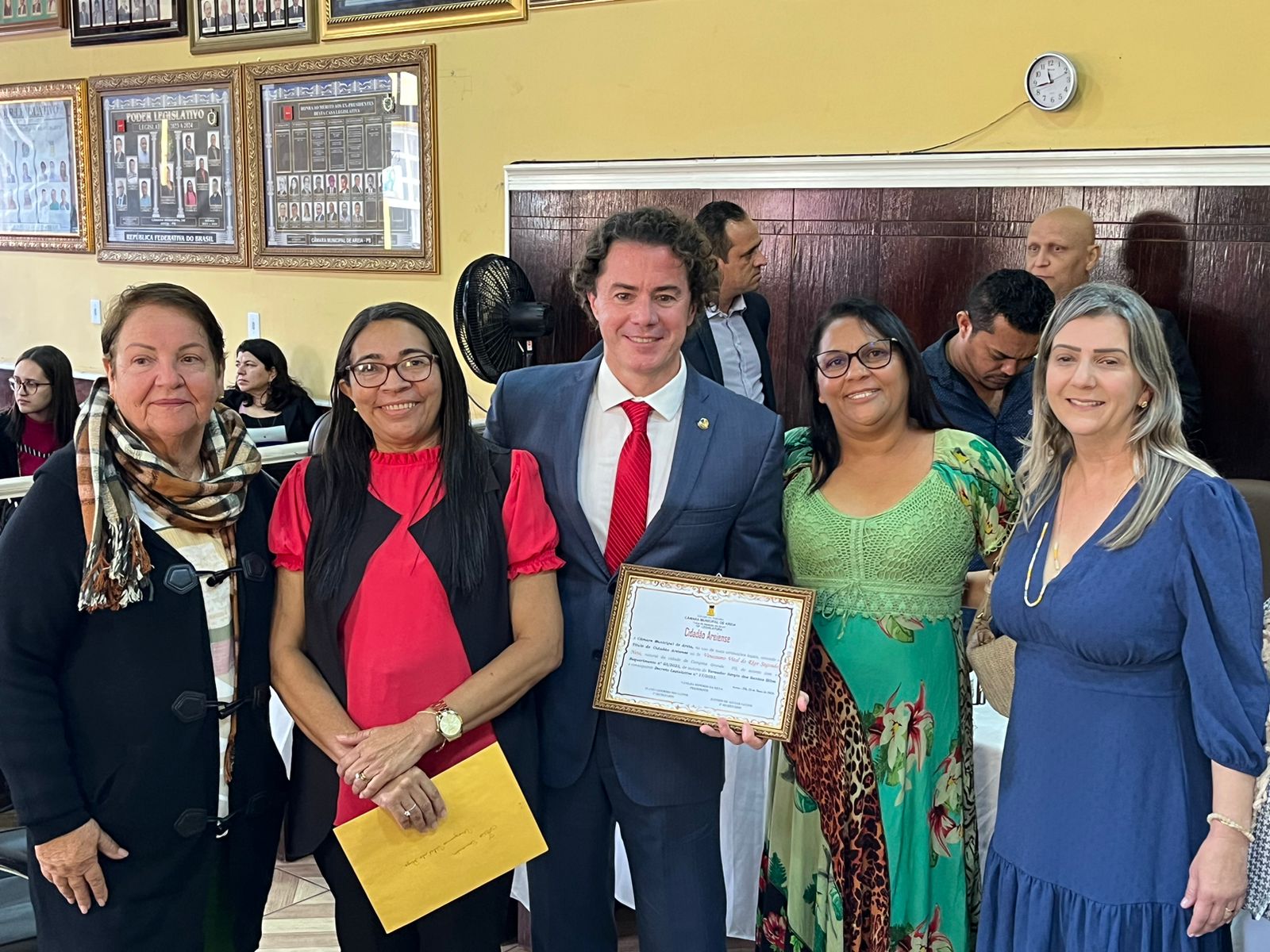 Veneziano recebeu uma homenagem especial dos servidores da Saúde do município, pelos recursos destinados a esta área e também por sua luta em favor de bandeiras importantes, como o Piso da Enfermagem e o Piso dos Agentes Comunitários de Saúde – ACSs e Agentes de Combate a Endemias – ACEs. O ACS Kleveny Soares falou em nome dos servidores da Saúde.