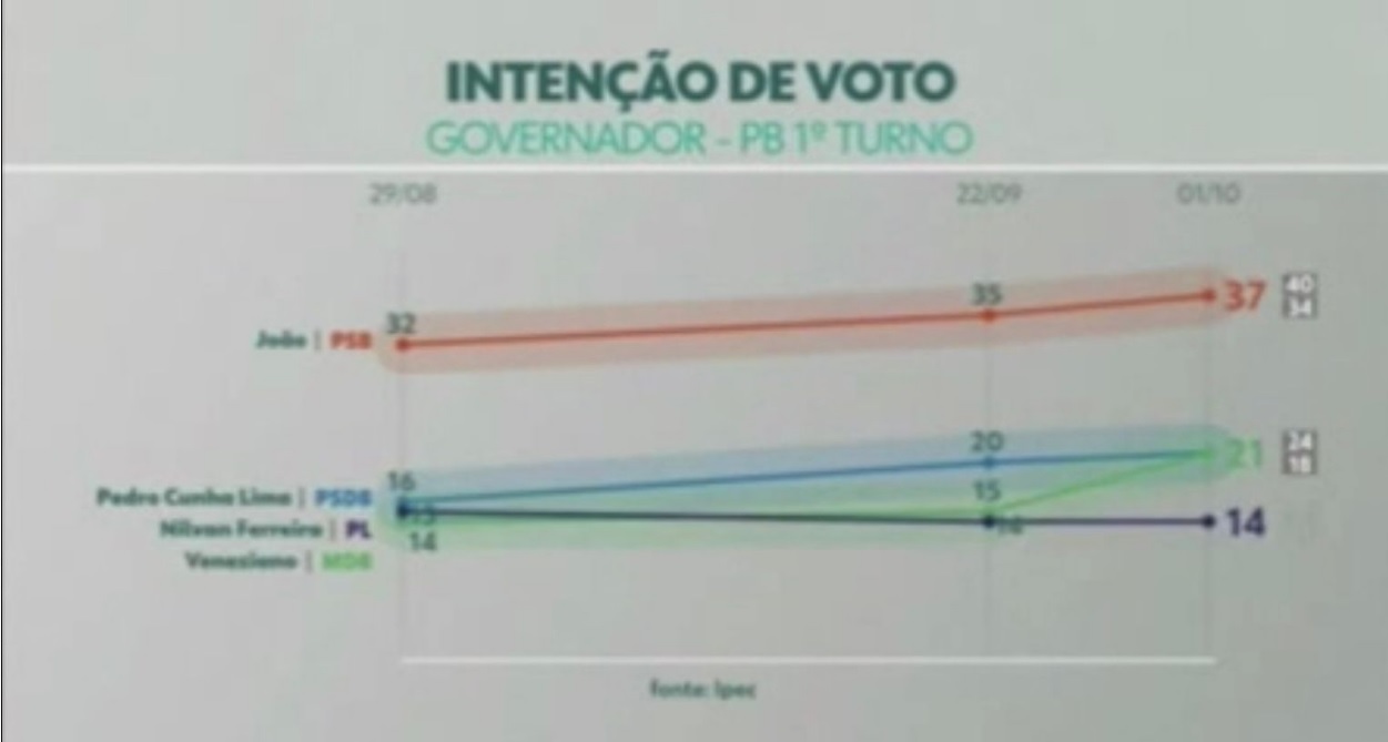 Em relação à pesquisa Ipec anterior, divulgada no dia 22 de setembro, há pouco mais de uma semana, portanto, Veneziano cresceu seis pontos, passado de 15% para 21%, o que dá uma média de praticamente um ponto por dia. O segundo foi o candidato João Azevedo (PSB), que cresceu dois pontos, passando de 35% para 37%. Pedro Cunha Lima subiu um ponto, passando de 20% para 21%. Já Nilvan Ferreira (PL) não apresentou crescimento, pois obteve 14% nas duas pesquisas.