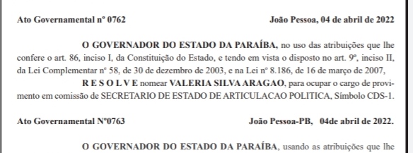 O governador João Azevêdo (PSB) nomeou a vereadora de Campina Grande, Valéria Silva Aragão, para o cargo de Secretária de Estado de Articulação Política da Paraíba. A nomeação foi publicada no Diário Oficial desta terça-feira (5).