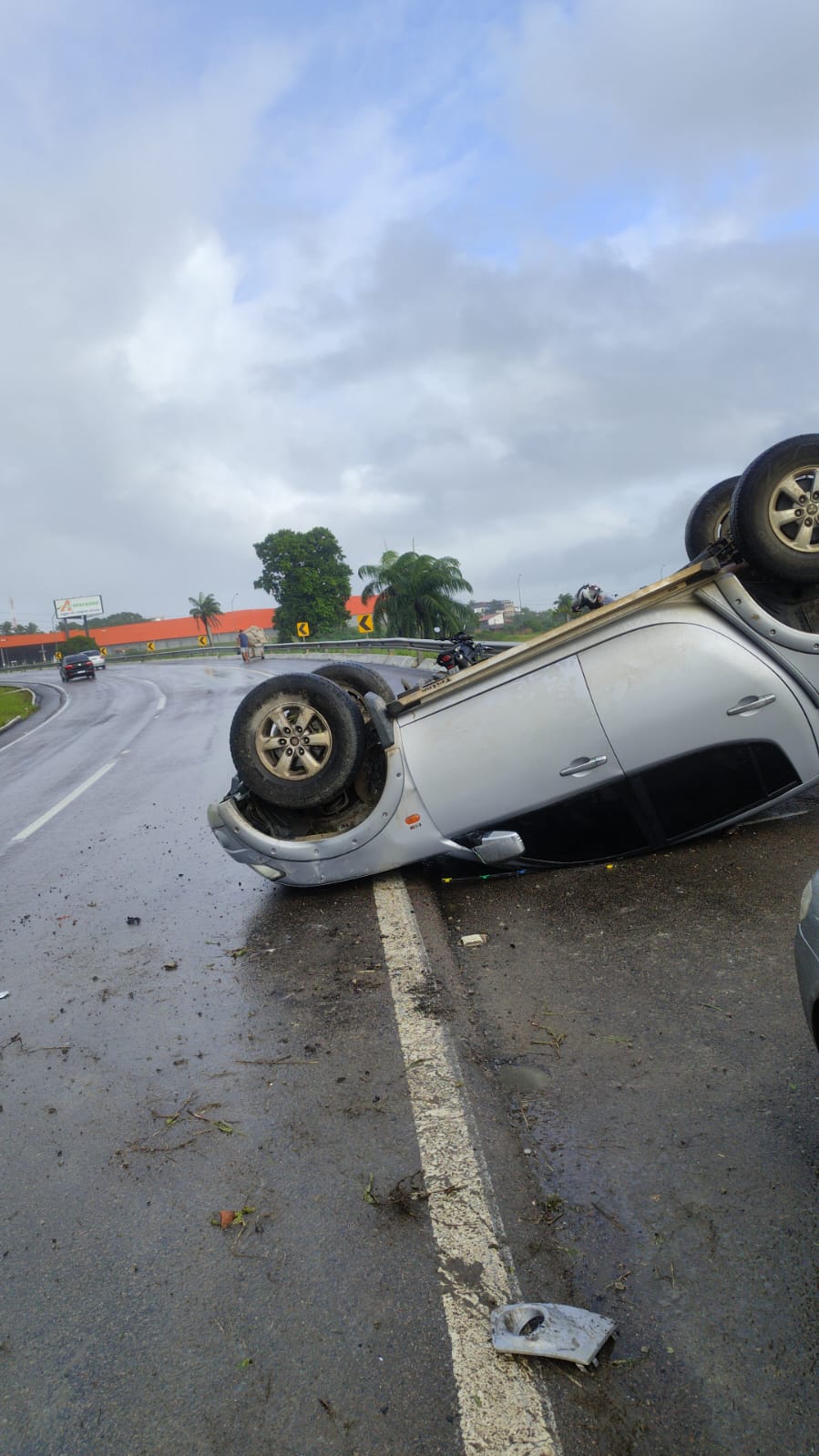 Um capotamento foi registrado na manhã desta terça-feira (24) na BR-230, nas proximidades da subida do Atacadão, no município de Santa Rita, Região Metropolitana de João Pessoa. O acidente ocorreu durante um momento de chuva, o que pode ter contribuído para a perda de controle do veículo.