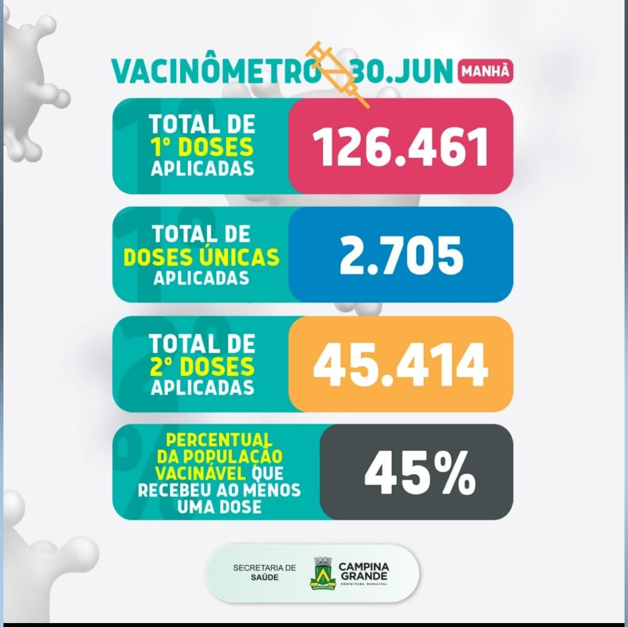 A partir desta quarta-feira, 30, a Secretaria de Saúde de Campina Grande passa a contabilizar os dados da vacinação com base no número de doses aplicadas diariamente.