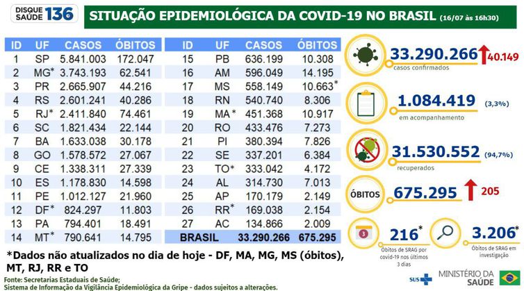 Com as novas informações, o total de pessoas infectadas pelo novo coronavírus durante a pandemia soma 33.290.266