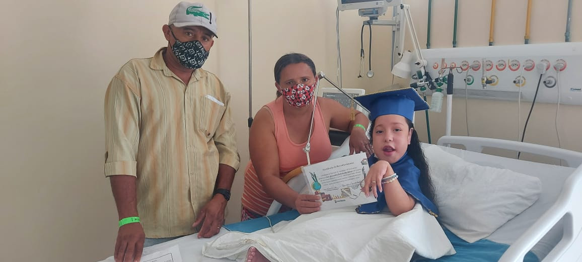 A pequena Alexsandra Barbosa, de 9 anos, portadora de distrofia muscular congênita dependente de ventilação mecânica, recebeu seu diploma em uma cerimônia simbólica na própria unidade hospitalar, ao lado dos pais Adeildo dos Santos e Edilene Barbosa.