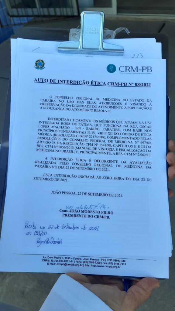 O Conselho Regional de Medicina do Estado da Paraíba (CRM-PB) interditou eticamente os médicos que trabalham na Unidade Básica de Saúde (UBS) Integrada Rosa de Fátima, no bairro de Paratibe, em João Pessoa, após fiscalização realizada na tarde desta quarta-feira (22). A unidade conta com quatro equipes de saúde da família, estando uma delas sem médico e outra com atendimento feito por profissional sem registro no CRM-PB. Além disso, faltam equipamentos básicos para consultas e estrutura física apresenta problemas graves, com ambiente insalubre para profissionais e pacientes.