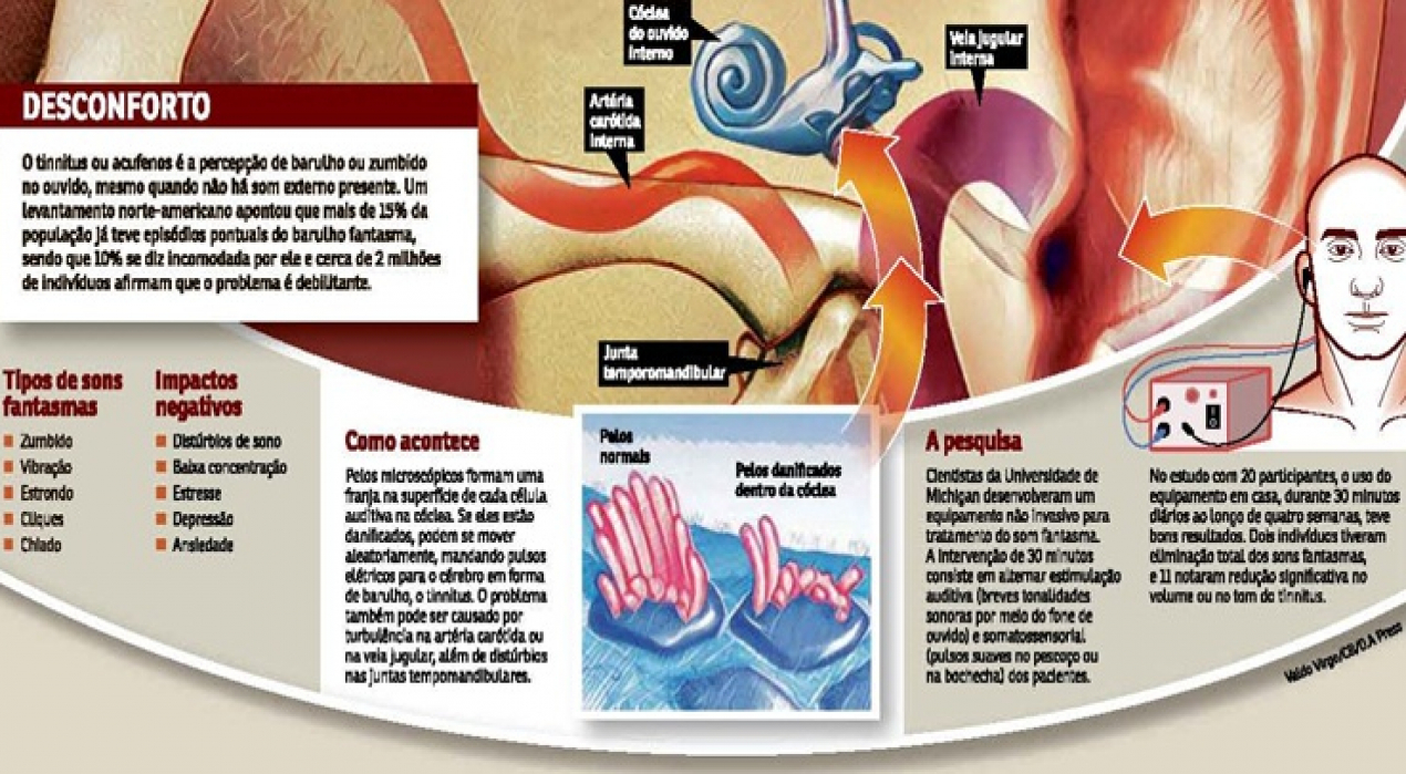 Agora, em um experimento com 20 voluntários, descrito na revista Science Translational Medicine desta semana, pesquisadores da Universidade de Michigan, nos Estados Unidos, demonstraram que um tratamento experimental não invasivo é capaz de minimizar e, em alguns casos, acabar com o problema. Trata-se de um aparelho que consegue calar os sons fantasmas se focando na atividade desordenada de alguns nervos no cérebro.