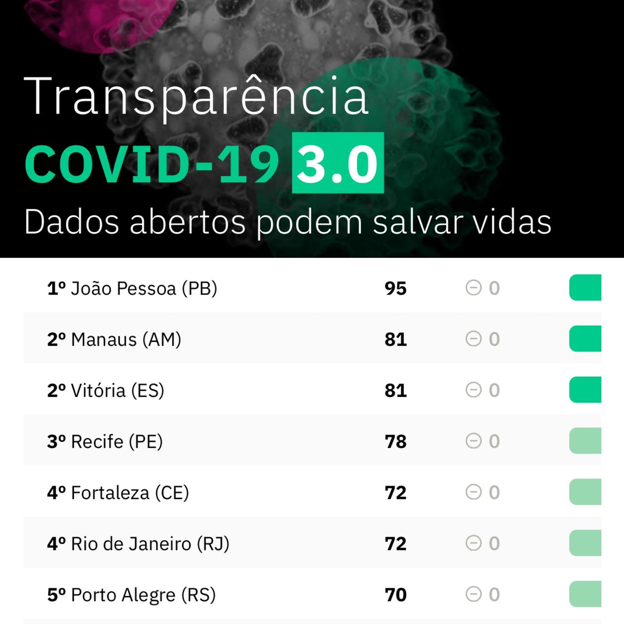 A Prefeitura Municipal de João Pessoa (PMJP) alcançou o 1º lugar no Índice de Transparência da Covid-19 da Open Knowledge Brasil, como a capital mais transparente do País, em relação aos dados da pandemia. A capital paraibana obteve uma nota de 95 pontos, seguida das cidades de Manaus (AM) e Vitória (ES), ambas com 81 pontos. O resultado foi divulgado na tarde desta quinta-feira (22) e pode ser conferido no link https://transparenciacovid19.ok.org.br/itc