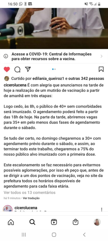 De acordo com Cícero o intuito é aplicar o quanto antes as doses de vacina que estavam sendo guardadas para a segunda aplicação e que devem ser liberadas pelo governo do Estado para serem usadas em primeira dose no intuito de avançar na imunização.