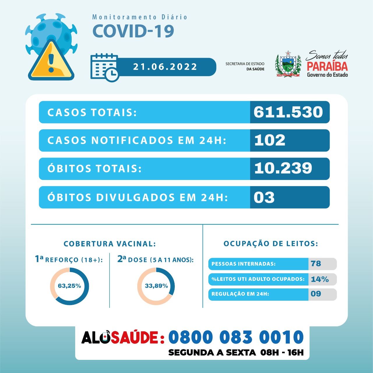 Nas últimas 24h foram confirmados 102 casos de Covid-19 na Paraíba, todos leves. Até esta terça-feira (21) o estado já contabilizou um total de 611.530 casos da doença. Os municípios que mais apresentaram registros nas últimas 24h foram: João Pessoa (49), Campina Grande (25), Água Branca (10) e Cacimba de Dentro (4).