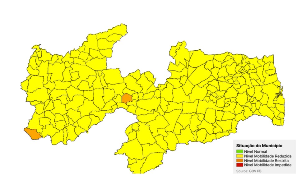 Apenas Cacimba de Areia e Santa Inês permanecem na bandeira laranja. As demais, 221, estão sob a bandeira amarela, com restrições mais brandas com relação à pandemia.
