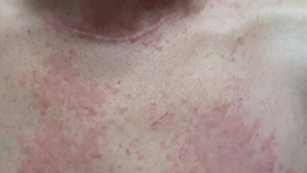 Os principais sintomas apresentados foram lesões cutâneas, principalmente nos membros superiores e tronco, acompanhadas de escoriações. Embora não tenha sido frequente, houve relato de dor de garganta, diarreia, febre e outros, em uma proporção menor de casos.