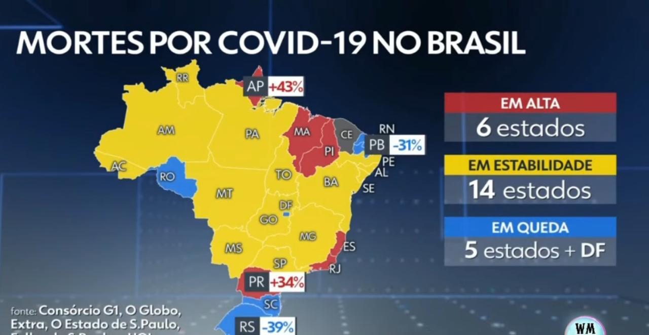 De acordo com o levantamento, além m dele, Distrito Federal, Santa Catarina, Rondônia, Rio Grande do Norte e Rio Grande do Sul, também registraram queda no número de mortes nas últimas 24h. No último domingo (11), Paraíba registrou uma queda de 18%. no número de mortes pela doença.