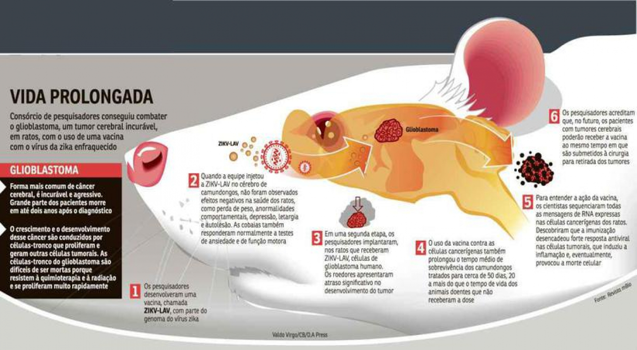 O zika vírus é temido pela capacidade de exterminar células neurais, característica que pode causar microcefalia e outras más-formações cerebrais em fetos de gestantes infectadas. Pesquisadores internacionais transformaram esse mecanismo negativo em vantagem no tratamento de tumores cerebrais. Eles retardaram o desenvolvimento do glioblastoma, um câncer severo e incurável, em ratos usando uma vacina cuja fórmula tem parte do genoma do zika. Os resultados foram animadores e sinalizam que a abordagem pode ser preventiva e também usada para aumentar a sobrevida de paciente oncológicos.